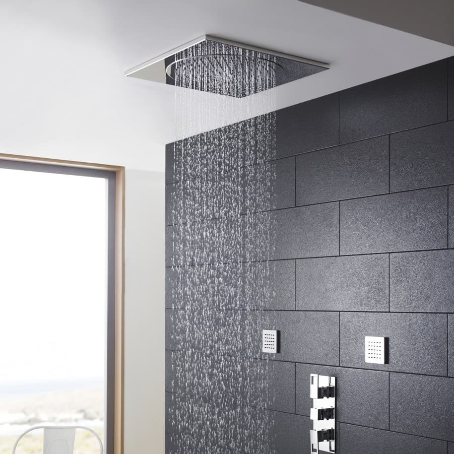 Selon le style que vous choisissez, ce modèle peut être suspendu ou encastré directement dans le plafond. Il est important de mentionner que ce pommeau de douche nécessitera un travail de plomberie complexe et, dans la plupart des cas, obligera une mise à niveau du système. Par conséquent, il est préférable d'attendre un projet de rénovation de salle de bain de grande envergure lorsqu'on choisit ce modèle. Ce dernier peut s'adapter très bien aux salles de bain où le plafond est trop bas pour une douche traditionnelle.